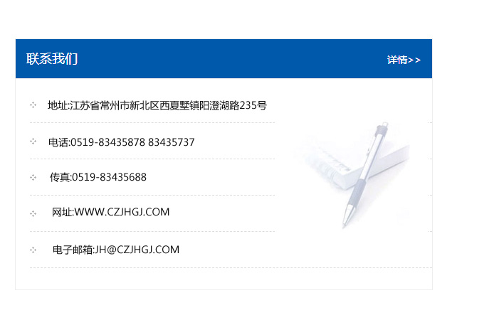 地址:常州市新北區友邦商務大廈1幢16、17層  電話:0519-85101652  傳真:0519-85112595  郵編:213022  網址:www.cz-jiayue_cn.beimengwood.com  郵箱:xiajifengaa@163.com